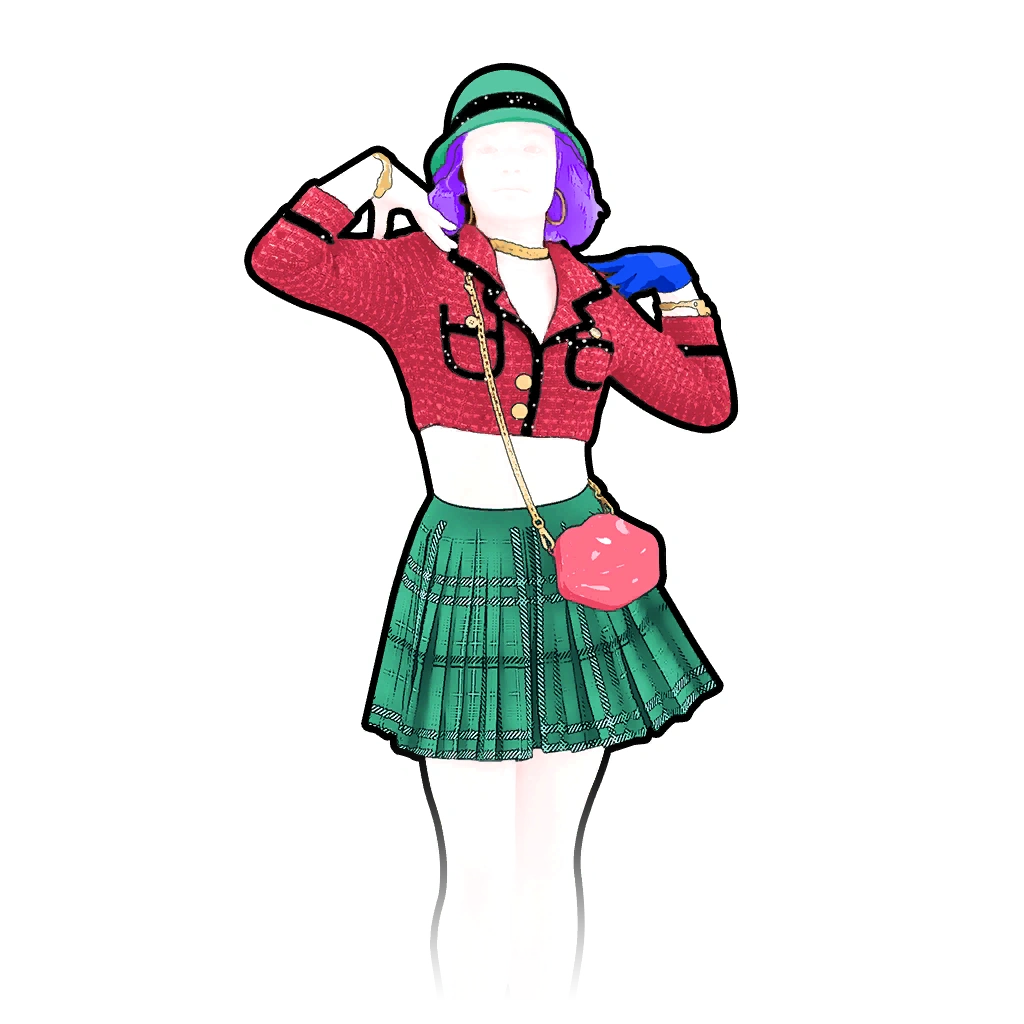 A dançarina é uma mulher em roupas casuais de estilo vintage. Ela tem um chapéu estilo balde verde claro com uma borda preta grossa ao redor do chapéu, com seu cabelo roxo ametista aparecendo nas laterais e brincos argola dourado. Ela usa um casaco de lã vermelho brilhante com bordas pretas na lapela e nos bolsos, e faixas pretas nas mangas do braço. Ela também usa uma saia xadrez verde-claro, meias azul-claras e salto rosa com três tiras. Em seu corpo está uma bolsa tipo estilingue rosa claro projetada para lembrar lábios com correntes douradas claras, e em seus pulsos há um par de pulseiras douradas claras com designs diferentes, com a pulseira esquerda em um desenho circular e a pulseira direita em um desenho em forma de lágrima. Ela tem uma luva azul e tem um contorno negrito de branco a preto, com o contorno externo sendo mais largo do que o contorno interno.