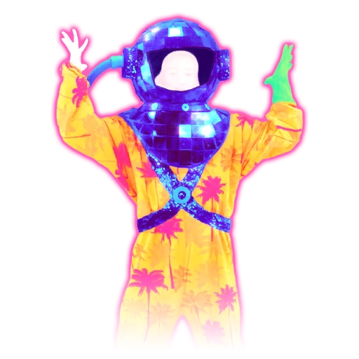 O dançarino é um mergulhador masculino. Seu terno é amarelo com laranjeiras, vermelho e rosa palma sobre ele, e ele usa um indigo disco-esfera capacete incrustado e sapatos roxos.