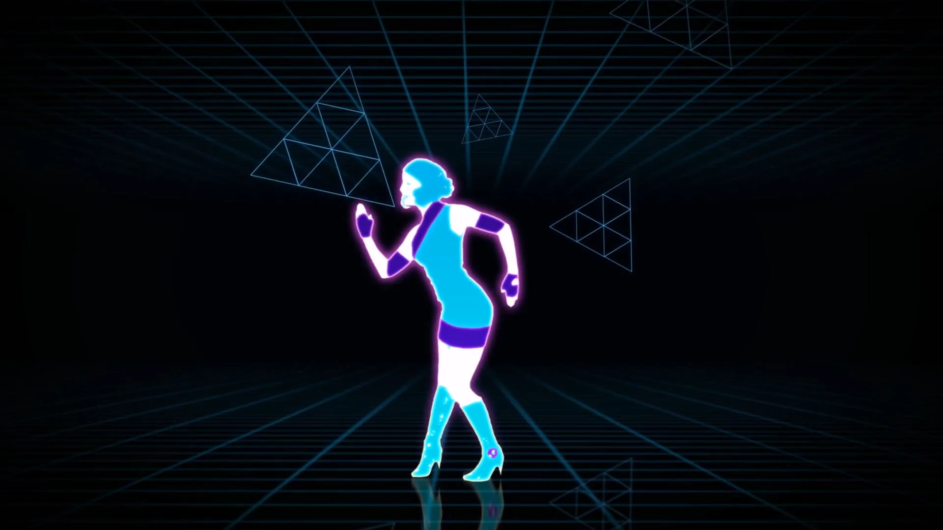 O fundo é uma sala azul escura com um piso reflexivo. A parede é cerceta escura nos cantos e mais clara no meio; na parede, há uma grade azul clara, semelhante aos primeiros gráficos da linha 3D e triângulos voadores com linhas que formam mais triângulos da mesma cor. Duas linhas roxas no topo e no fundo cercam a parede.