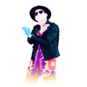 O dançarino é um homem com óculos escuros e um chapéu preto. Ele veste uma camisa rosa, roxa e laranja com uma jaqueta preta por cima. Ele tem calças rasgadas cor laranja e sapatos rosa. Ele tem um contorno de linhas duplas que é uma linha sólida e uma linha pontilhada.