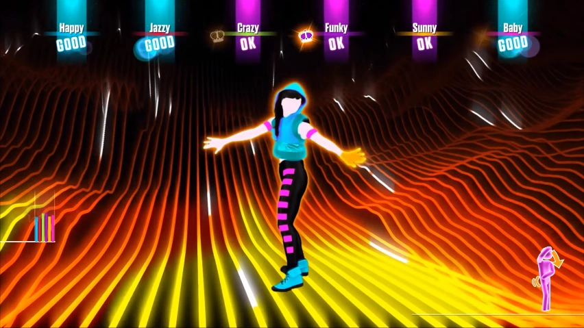 A dançarina é uma menina que tem cabelos pretos em uma trança deitada à esquerda, um tanque recortado de jade com um capuz, dois braceletes de bracelete rosa quente, meias preto com listras magenta nos lados e sapatos azul.