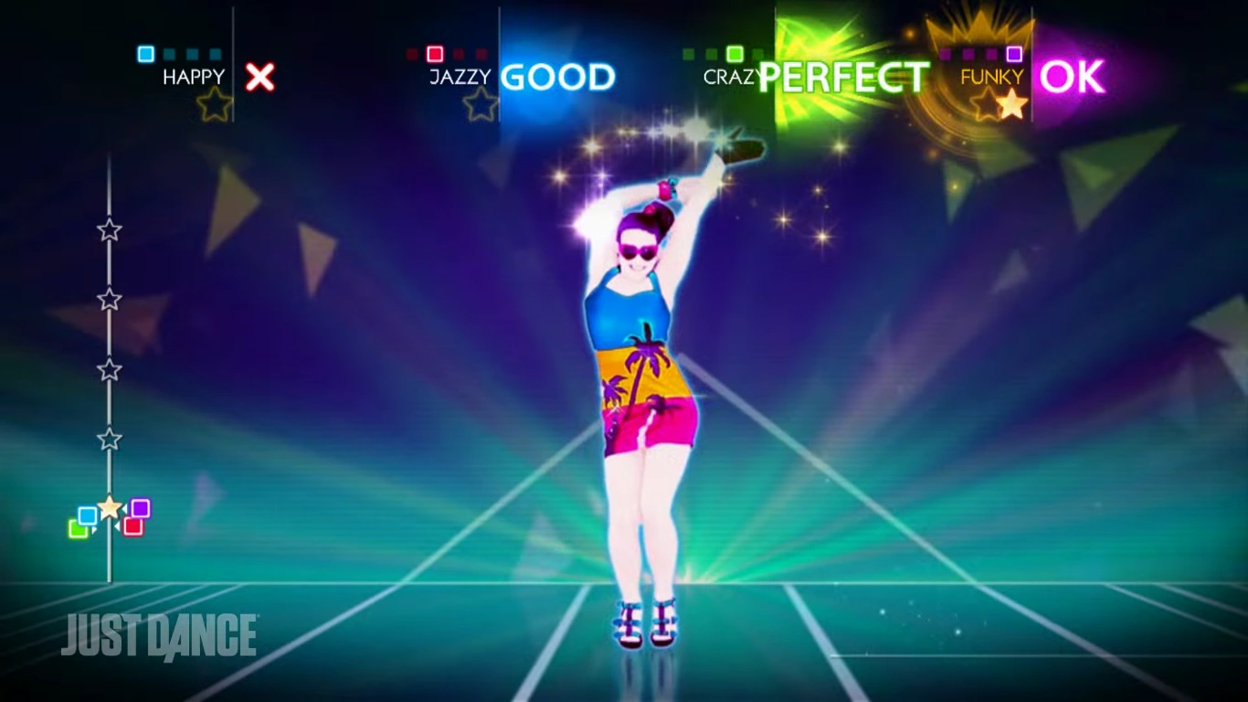 A dançarina é uma mulher, está usando um vestido adornado com palmeiras roxas. Tem uma cor da camada com a cor-de-rosa na parte inferior, dourado-amarela o meio, e o azul-céu na parte superior que inclui as correias, mas um pouco mais escuro. Ela tem cabelo roxo em um rabo de cavalo alto e usa um par de óculos de sol em forma de coração rosa, pulseiras rosa e azul no pulso direito e cunhas azul escuro. A dançarina tem um brilho azul ao redor de seu corpo.