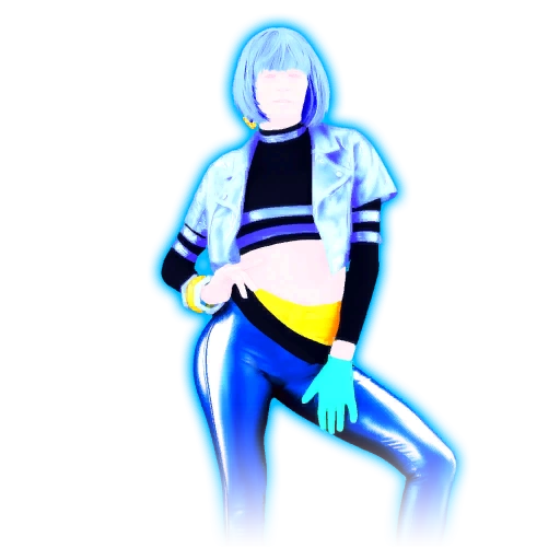 The dancer is a woman who has short blue hair, a blue jacket, a black top with blue stripes and black sleeves, blue/yellow pants, a cyan glove, and blue/yellow high-top sneakers. She resembles Gigi Rowe in the music video.