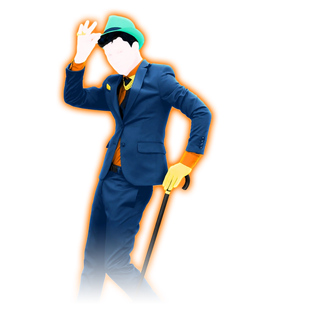 The dancer is a man named Caldwell, who wears Charleston-themed clothing. He wears an aquamarine fedora over short black hair, along with a navy blue tuxedo with an orange highlight on its right arm and a golden piece on the left part of its collar, an orange dress shirt with a black tie and a golden collar, matching navy blue pants, a black belt, orange socks, and black shoes with aquamarine highlights. His most notable feature is his black cane which he performs with throughout the entire routine. He also wears a vivid yellow glove, specifically deep ripe lemon. He has an orange outline.