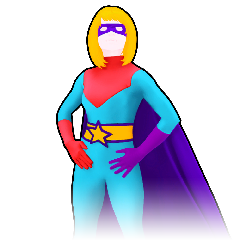 The dancer is a superheroine. She has blonde hair in a bob cut. She wears a purple mask and cape, a cerulean bodysuit with a yellow belt which has a star buckle and a purple outline, red boots with star motifs, and a red glove for her left hand with a pink glove for her right one.