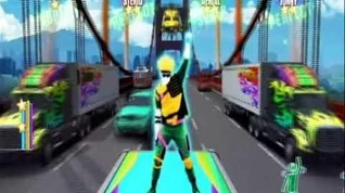 In the tunnel, there are LED signs with the words "another one bites the dust" scrolling through them. The coach starts performing moves to avoid hitting his head on the signs, with one of them brushing against his hair. During the bridge, the truck drives at breakneck speeds before catching up with a Just Dance truck and the coach performs a side flip onto the Just Dance truck. The Just Dance truck then catches up with another truck as the coach side flips onto the truck as well.