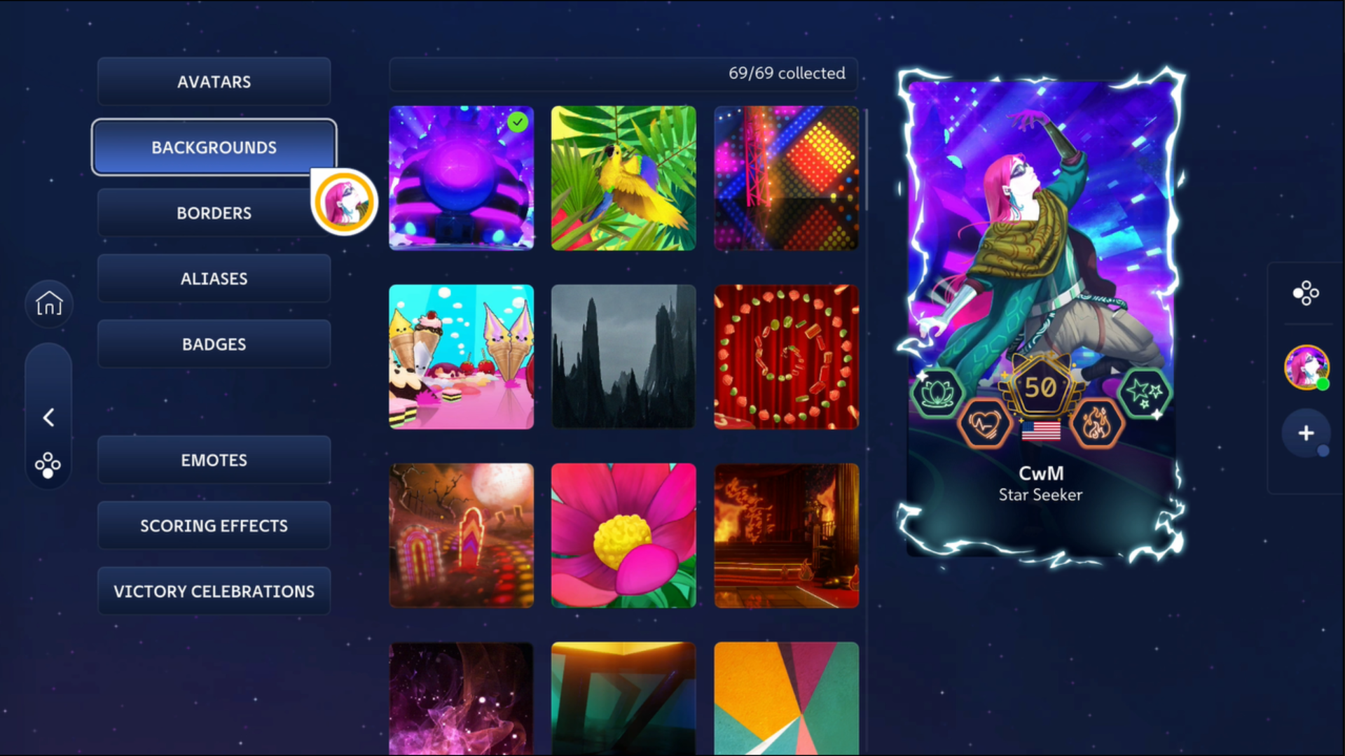 Backgrounds are unlockable wallpapers that appear behind your profile. They first appeared in Just Dance 2023 Edition. The backgrounds correspond to past routines and their titles and captions provide bits of lore about the environments they depict.