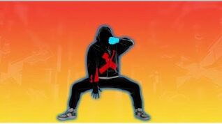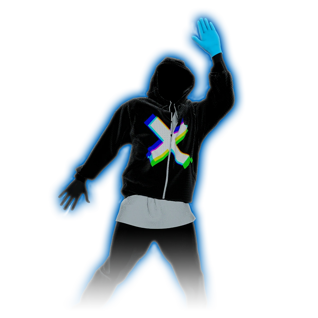 The dancer is a 3D modeled man named Umbra, whose face and skin are blacked out. He wears a black hoodie with a gray shirt underneath, a pair of black pants, and a pair of gray and some silver sneakers. His hoodie and pants have various patterns passing through them. It has a silver diamond shape during the chorus, a silver triangle that occasionally extends into blue triangles during one of the vocal verses, a red X shape during one of the instrumental verses that occasionally turns silver and has silver lines surrounding it, a pink circle along with blue cut off circular lines on the slow instrumental verses, and a white circle that moves during the end. Numerous stripes and dots in numerous colors also sift through the dancer’s outfit.