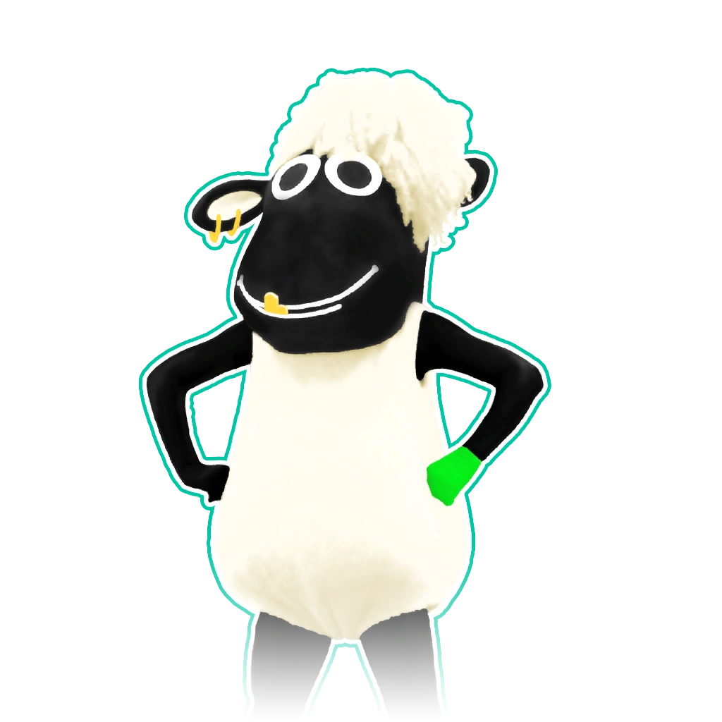 The dancer is an anthropomorphic sheep named Sheep, who has jet black skin and long white wool. It has a cartoonish face with big eyes, two yellow piercings in its left ear, yellow teeth, a green glove on its left hand, and a pair of black sneakers with white soles.