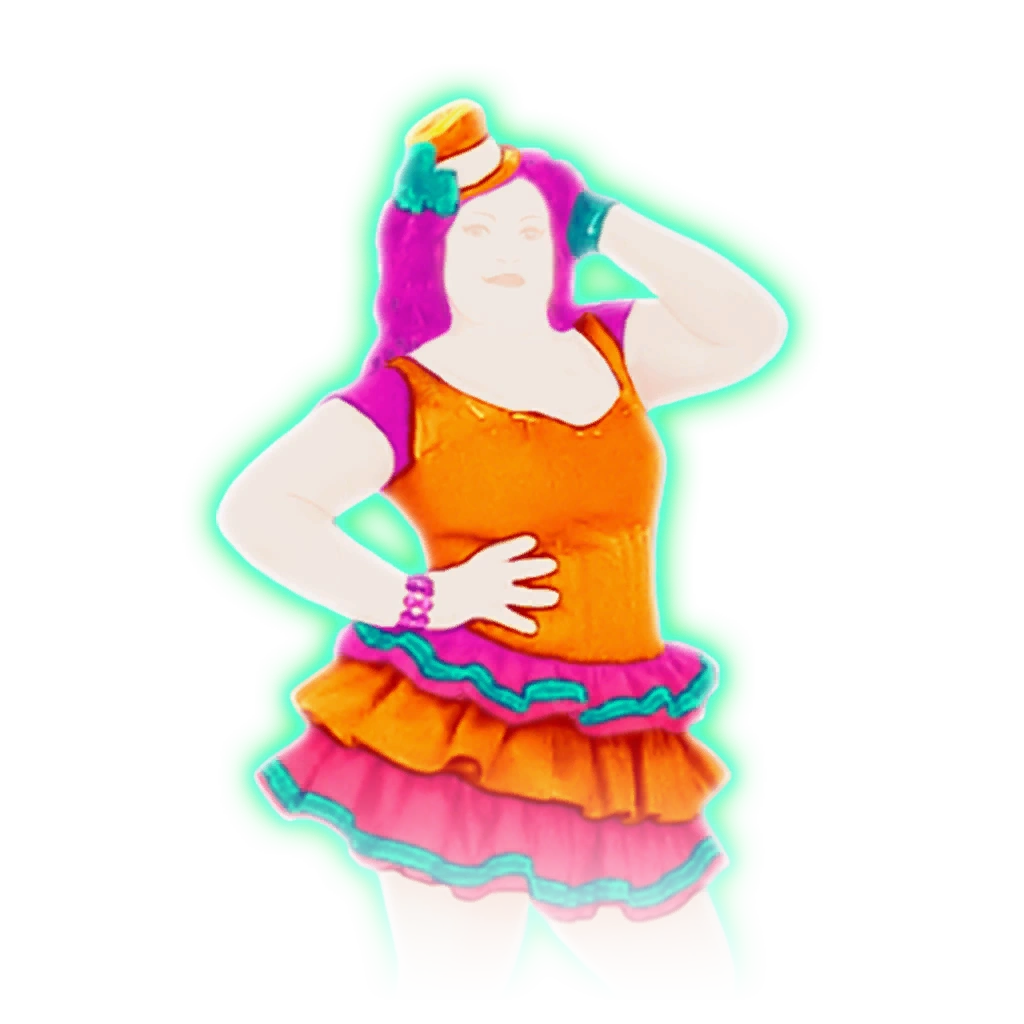 The dancer is a plus-sized woman named Bella with magenta flowing hair. She wears a small orange top hat with a white line and a sea green flower, an orange dress with pink and sea green ruffles on both her waist area and bottom of her dress, and sea green flats. She also wears a pink bracelet on her right wrist. She wears a light lime green glove.