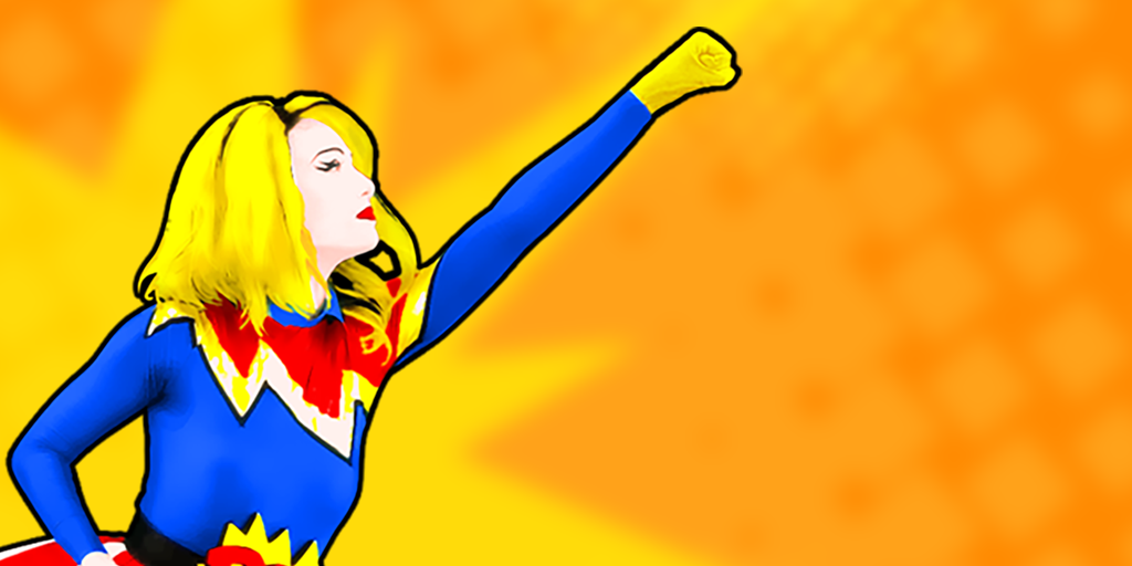The dancer is a woman called Stargirl[3] who is mainly a comic-styled superhero character. She has yellow hair and wears red lipstick. Her outfit resembles the flag of America because her dress has white and red stripes and her leggings are blue with white stars. Her top is mainly blue with yellow and red situated on the upper left shoulder. She also wears what is likely to be a belt that says POW! in a shock bubble. Her glove is also vivid yellow, specifically candlelight.