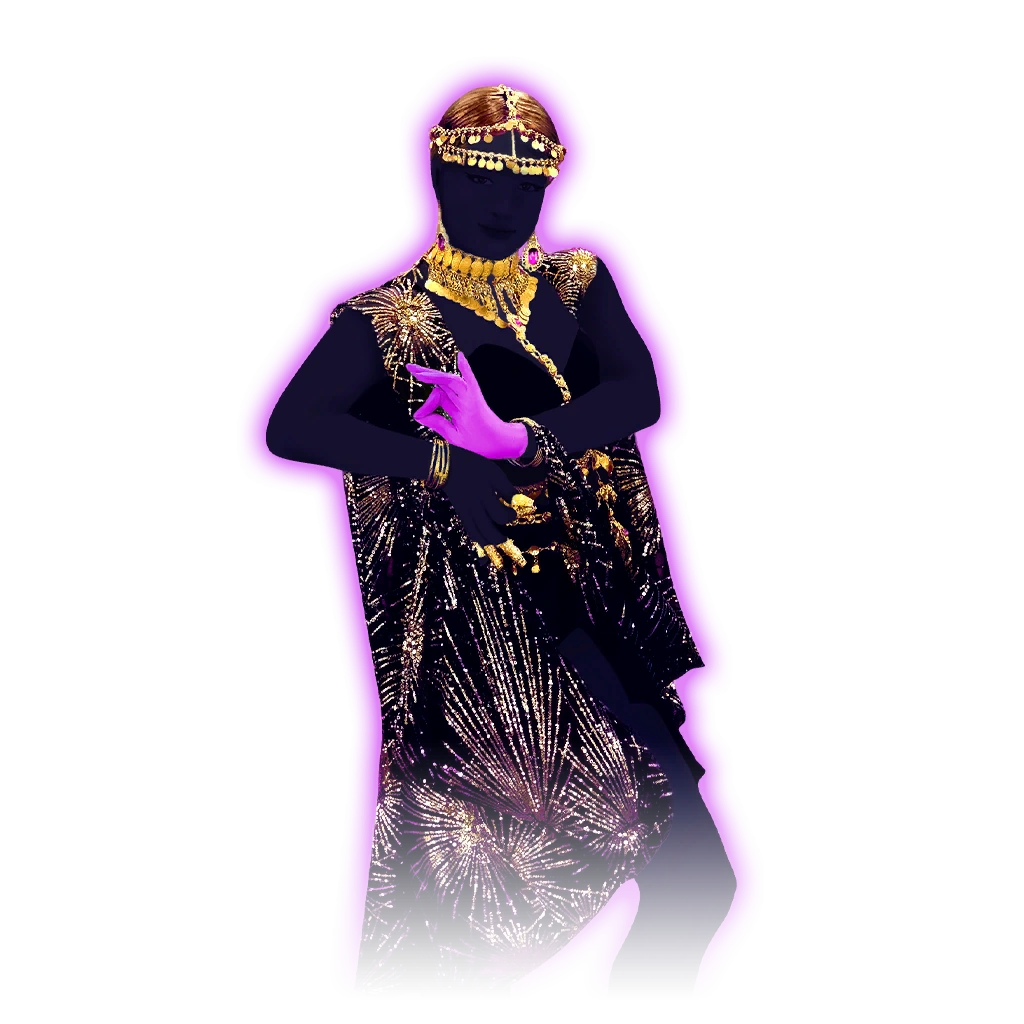 The coach is a woman dressed in a similar fashion as the coaches from the Classic routine. She wears a gold and black outfit which consists of a black bra and a black loincloth-like skirt with the golden aspects of the outfit glowing during various parts of the routine. She also wears a cape that is attached to both of her wrists. Additionally, she wears a pink glove on her right hand, and wears gold anklets and other jewellery. The coach’s skin is indigo and during Snoop Dogg’s verse and the verse that follows, golden sparkles can be seen on the coach’s skin.