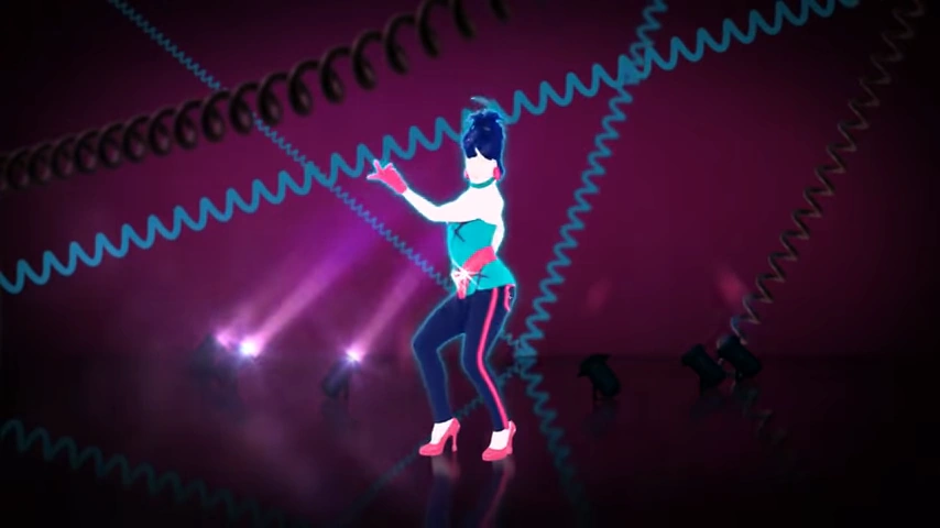 The routine takes place in a room with a teal wall. The wall fades into maroon on each side. Several holographic blue telephone cords move around the wall. There is one black telephone cord on the top left corner that is completely black, not holographic, and does not move. There are also several stage lights on the floor that light up to the beat of the song. At the beginning of the routine, the dancer's outline appears first before rapidly zooming in to reveal the full dancer. At the end of the routine, when the dancer walks offscreen, she flashes and fades out with the same outline effect.