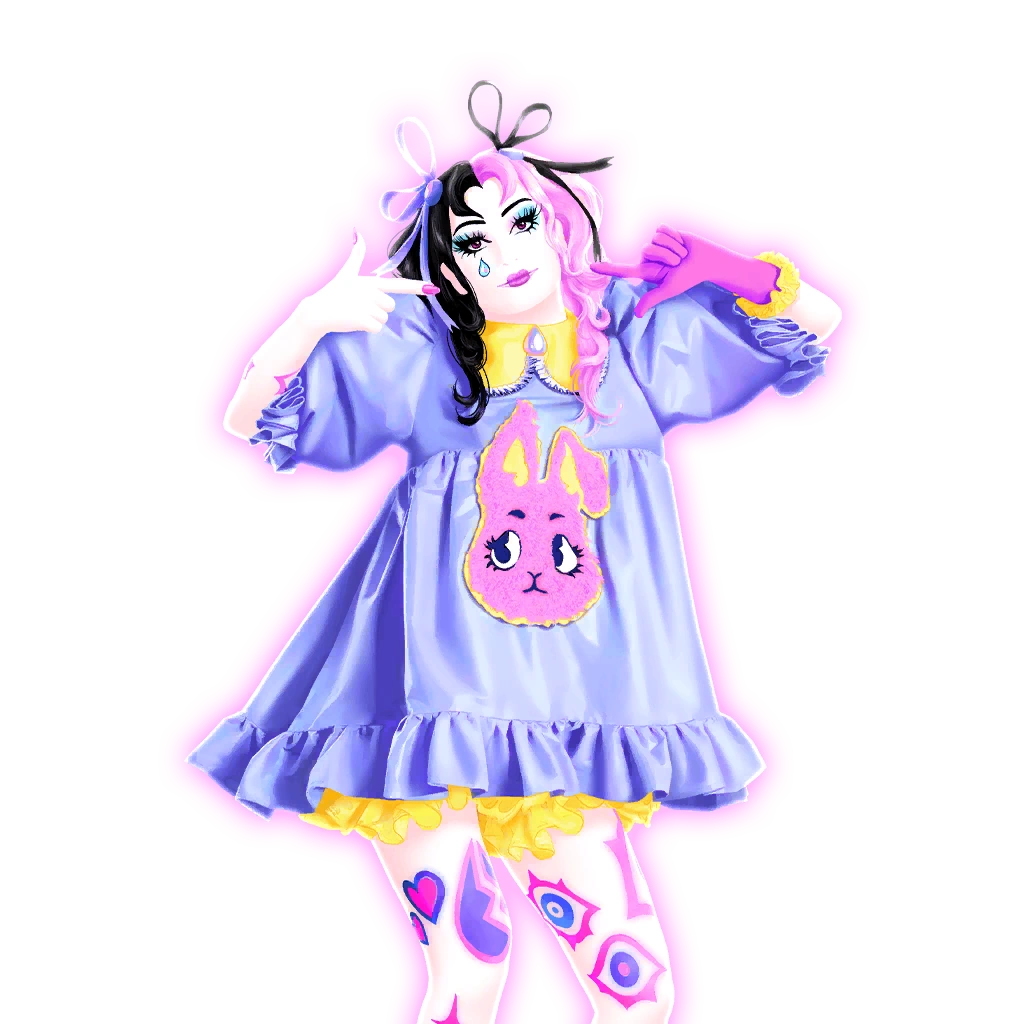 The dancer is a woman named Lucine who resembles Melanie Martinez. She has half-dyed black and pink hair in pigtails, with a lavender and black bow. She has white skin with a blue teardrop on her left cheek. She wears a periwinkle dress with puffy sleeves and an image depicting a sad pink bunny in the center. The bunny’s inner ears are yellow, and one of its ears are folded. She also wears yellow bloomers, pink socks, and yellow shoes. Purple and pink tattoos of hearts and eyes are on her left arm and legs. The nails on her left hand are painted pink. She has a magenta glove. Her outline is pastel pink.