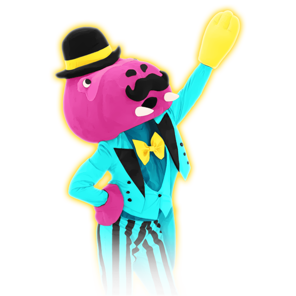 The dancer is a pink walrus with a black mustache. He is wearing a black top hat with a golden ribbon. He wears a cyan tuxedo with a teal shirt, a cyan vest and a golden bowtie. His pants are light blue with black stripes. He has black shoes with cyan details, and a golden glove.