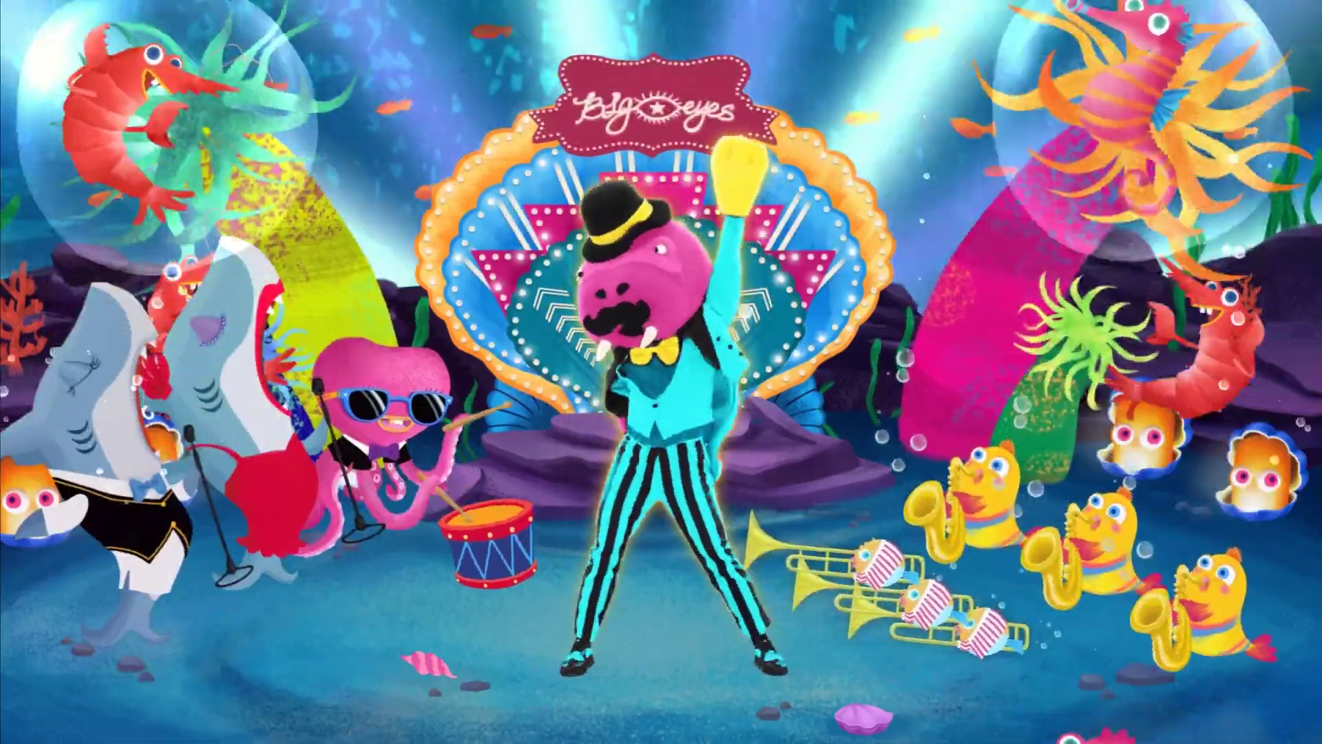 The background takes place under the sea, and there is an open clamshell featuring the words "Big Eyes" written in cursive and an eye in the middle on top. There are sea animals playing instruments. At the start, there are pufferfishes playing trombones and an octopus at the left playing the drums. When the background gets brighter, yellow fishes enter at the right playing the tuba.