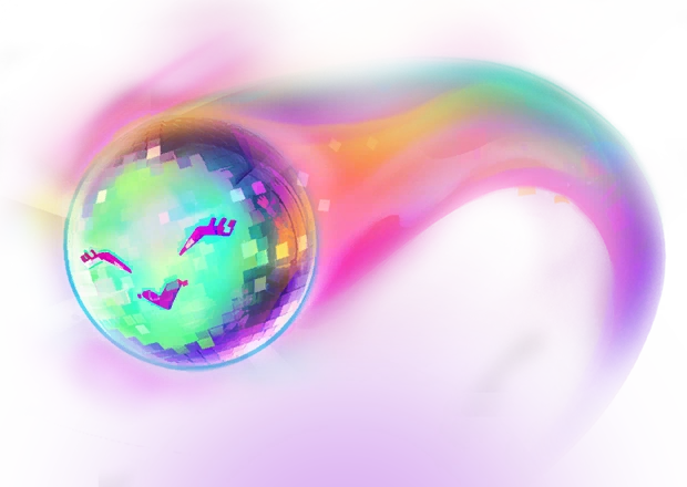 Discoball is a living disco ball emitting colorful light, being tied with Sara and Wanderlust's colorful surges of energy. Discoball is shown to be very playful and lively, interacting with many of the Danceverses' elements and environment in the backgrounds of various routines, including bopping playfully in one of the stalls and being chased around by a giant cat in an astronaut suit. They have a default face of a smiling V-shaped mouth with closed eyes that has visible eyelashes, but it quickly changes to have both features open to represent discomfort or shock.