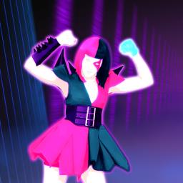 The dancer is a woman with bobbed hair divided into two sides: the left one is black and the right one is neon pink. She has a neon pink triangle pointing right on her right eye. She wears a dress that has shoulder puffs with dark violet spikes and a spiked skirt and is parted into four sections: neon pink on the top left and bottom right, and indigo on the top right and bottom left. On her left wrist, she has a dark violet spiked bracelet. Around her waist, she wears a dark violet belt divided into three stripes, each with a silver buckle. On her shoes, she wears purple glittery ankle boots with cyan soles. Her outline is purple, and it pulses when she hits her head with her fists.