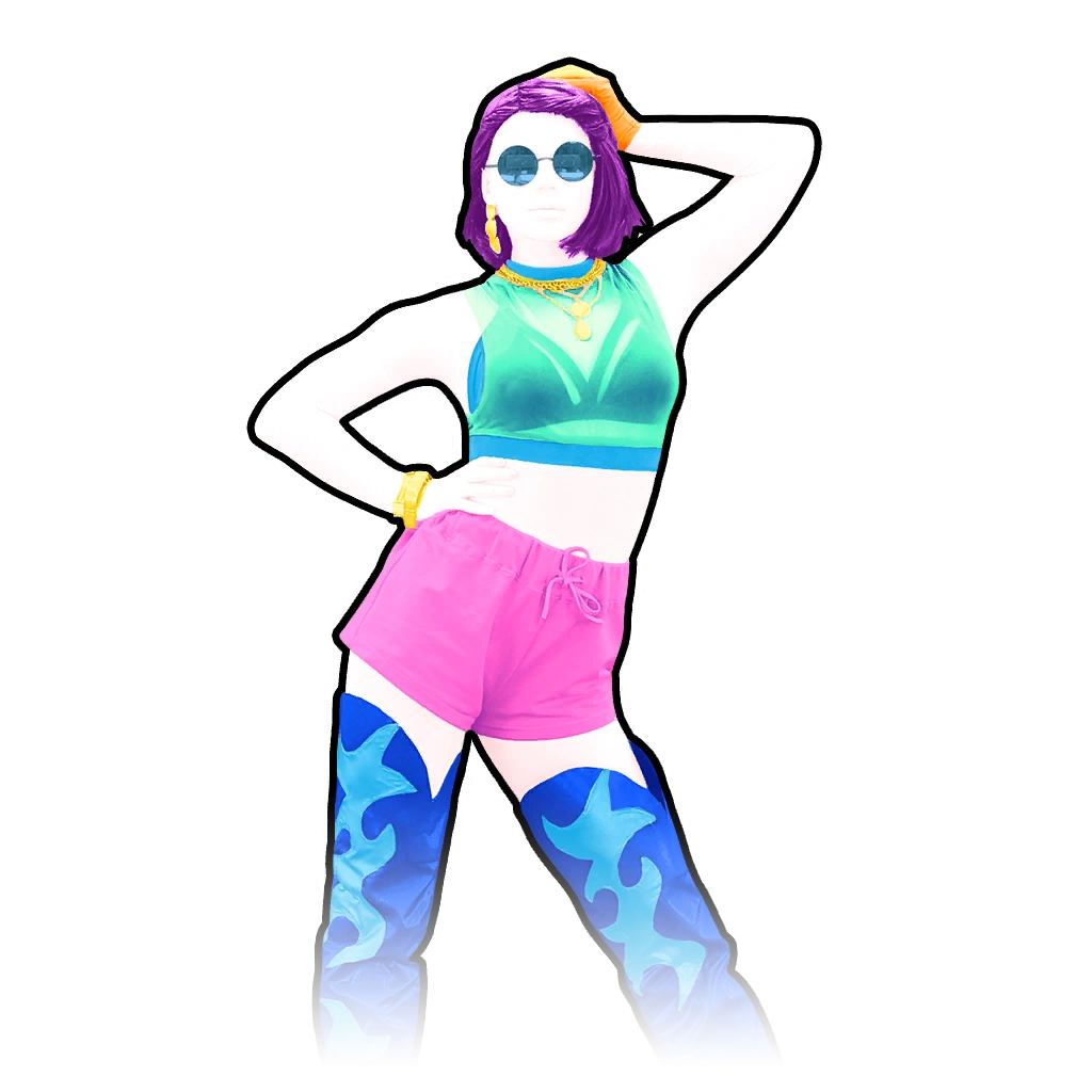 The dancer is a woman named Petra. She has grape purple hair in a long bob cut, with the right side covering her right ear. She wears a sky blue strapped bralette with a turquoise sheer sleeveless crop top over it. The rest of her outfit consists of a pair of light pink short shorts with matching drawstrings and blue thigh-high heeled boots with cyan flame designs down the sides. Her accessories include gold hanging earrings, a pair of dark turquoise circular sunglasses, a gold necklace, and a gold bangle on her left wrist. She has a black and white outline and wears a light orange glove, specifically porsche.