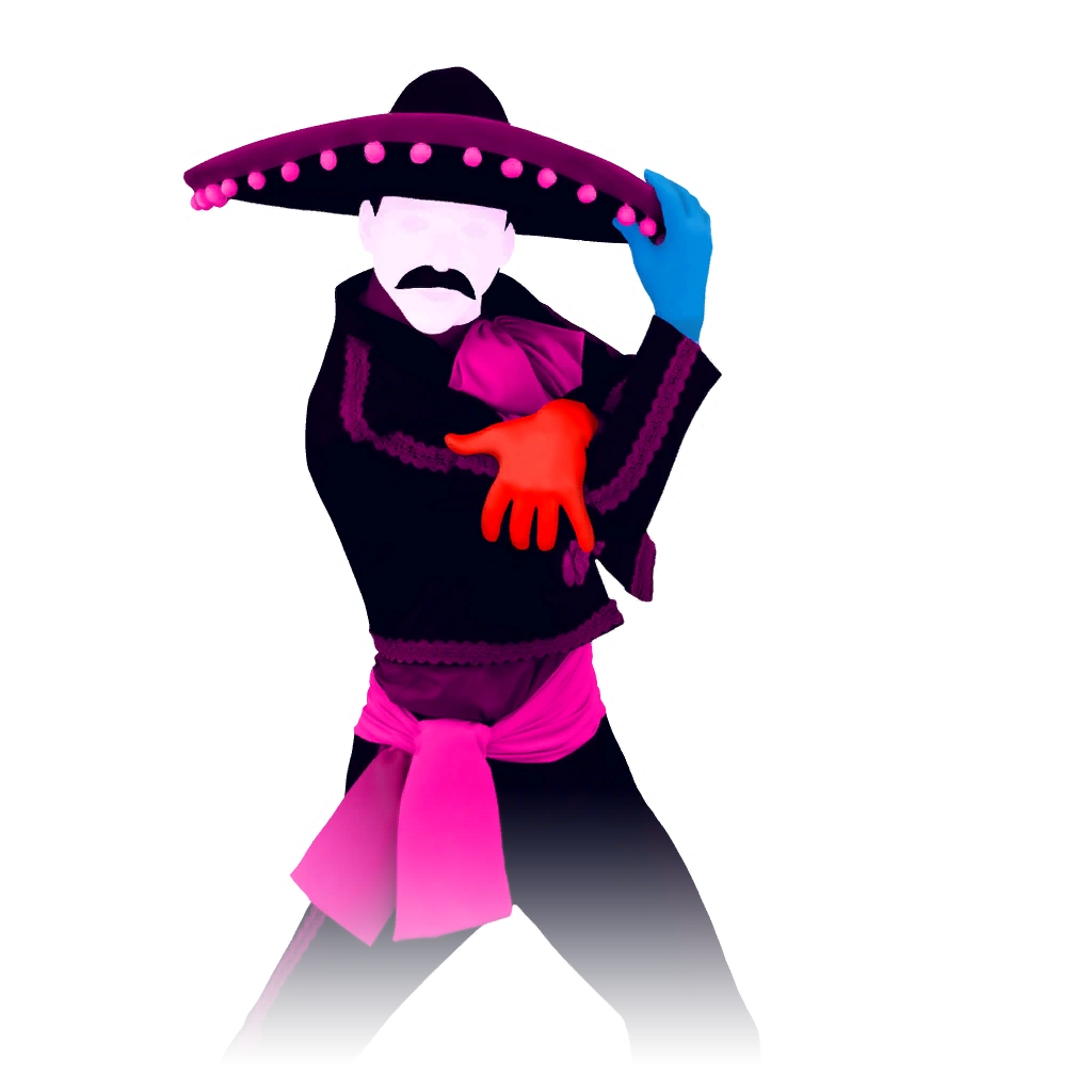 The dancer is a man dressed like a Mexican cowboy. He has a black mustache, and wears a black and purple sombrero, a black jacket and black pants, and a pink bowtie and cloth around his hips. He also has a triangle; in one hand he is holding the stick to play it with, and in the other hand, he is holding the instrument.