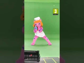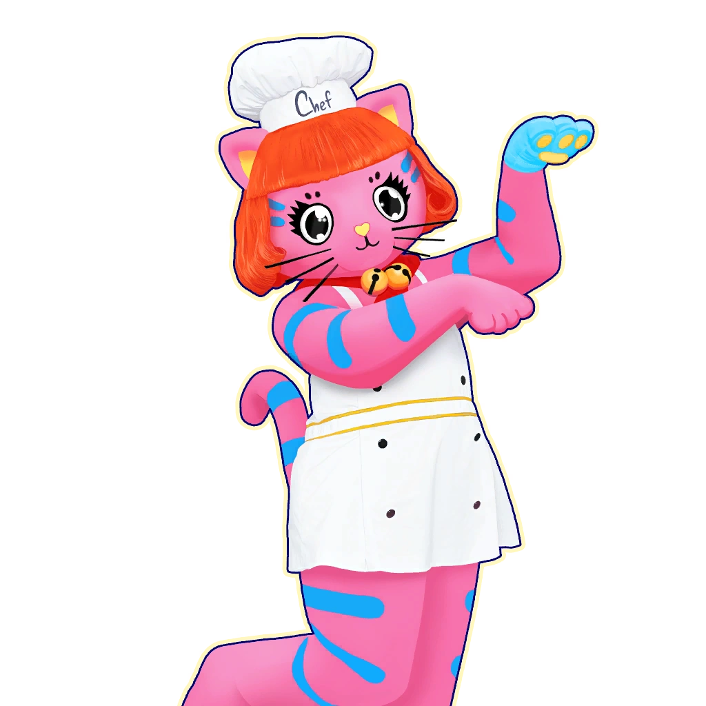 The dancer is Cooking Kitta, the coach from Kulikitaka. She now bares a more polished appearance in a chef attire. Her orange bow is replaced with a puffy white chef’s hat with the word "CHEF" on it and she wears an apron with two columns of buttons and gold stripes on its waist. She has two yellow bells and a red ribbon around her neck. Her glove has also been changed from lime green to sky blue.