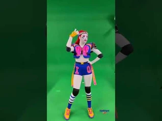 The dancer is Jennifer, the coach from Hot For Me,[3] with a new outfit. She now has red hair that is tied into two ponytails. She wears a blue headband with the word ‘Woodcrown’ written across it in yellow. Her shirt, inspired by American football is blue, with pink on her chest area, and yellow, pink, and blue stripes on her shoulders. She wears black arm pads and a yellow glove. She wears a black belt with a golden buckle. Her shorts are also blue, with the numbers ‘0’ and ‘1’ in pink on her left and right thighs respectively. She also wears black knee pads and high blue socks with three yellow stripes at the top. Her trainers are yellow with pink and blue on the tips and pink laces.