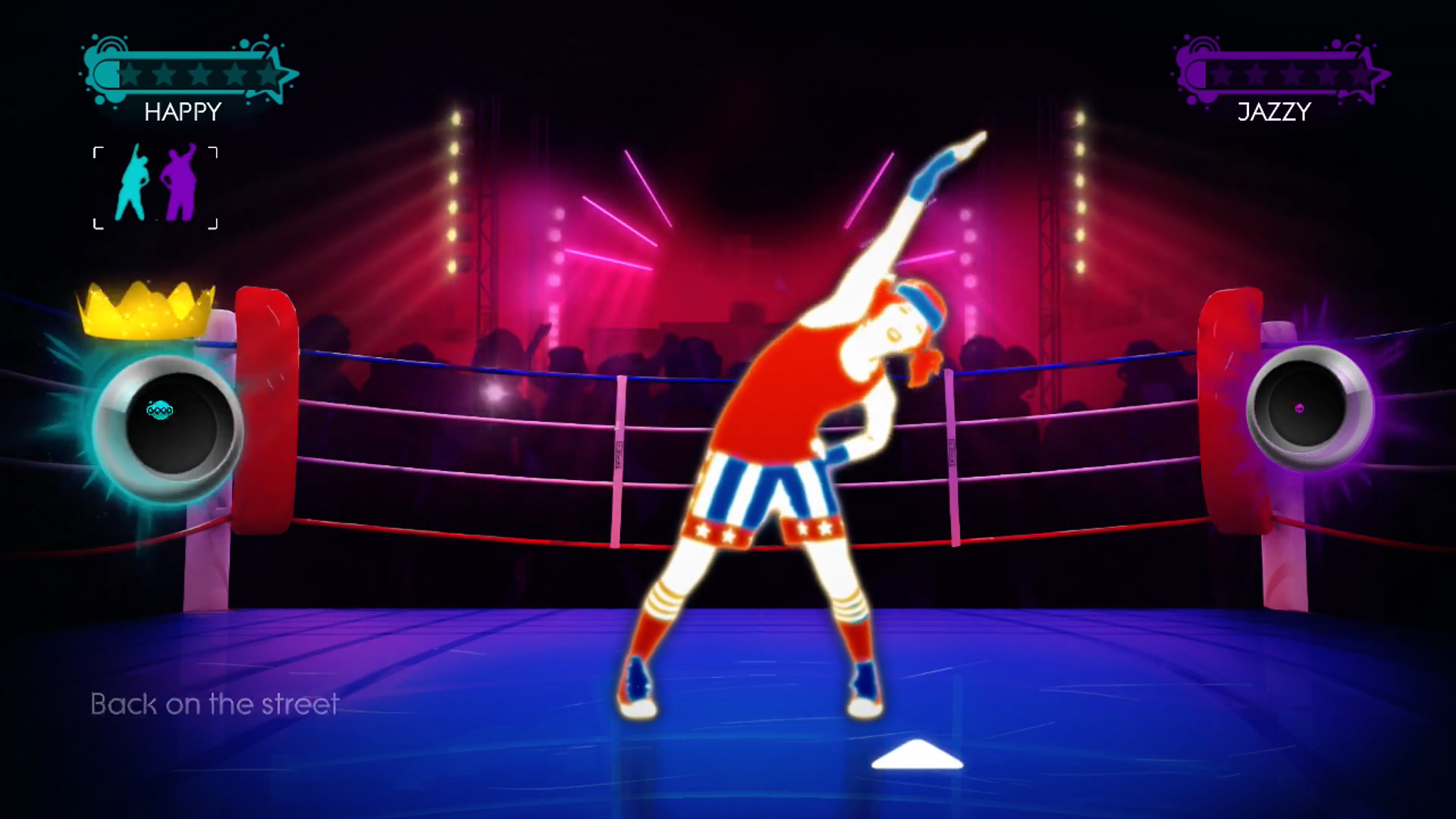 In the Wii version of Just Dance: Greatest Hits, the edges of the ring are now seen. The background is more detailed, with stage lights flashing to the beat. Occasionally, the lights emit brighter pink light. The audience behind the ring also move more. The camera flash lights have been removed.