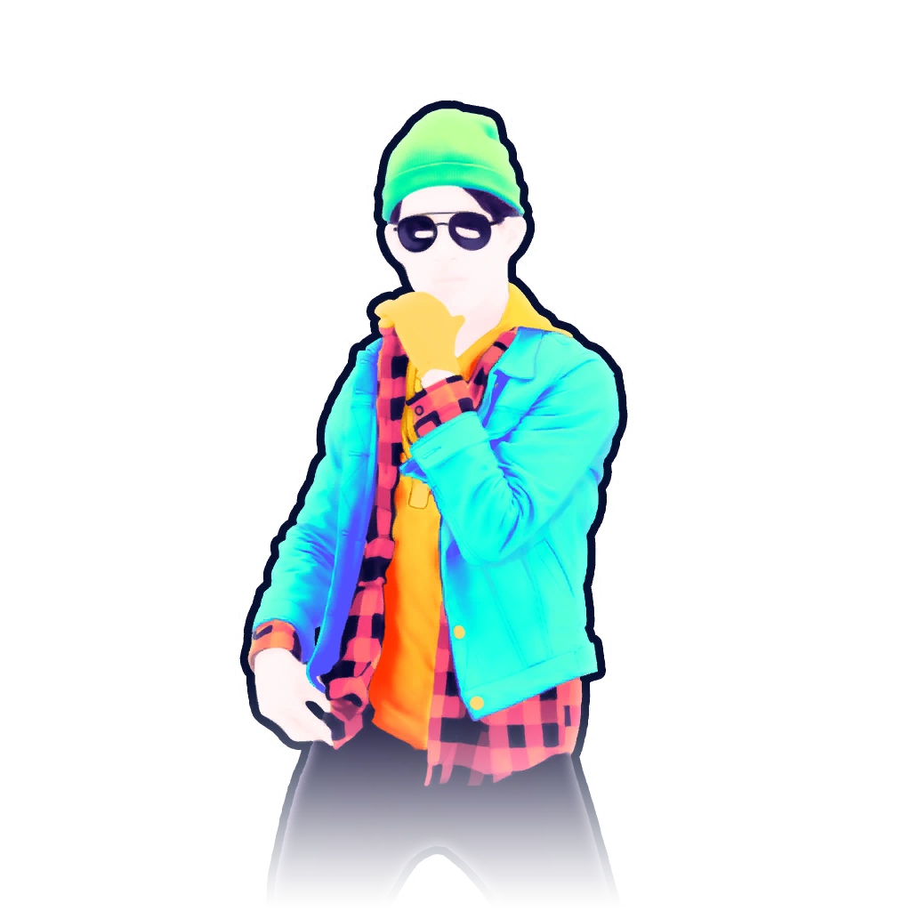 The dancer is a man with black combed hair hidden by a sea-foam green colored beanie. He wears a cyan hoodie and a red plaid jacket beneath it and underneath is an orange shirt. He also wears denim jeans, orange sneakers, a golden chain, and a very light yellow glove, specifically kournikova.