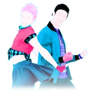 The background is very fast-paced and features several different animations very quickly. There is a split between the dancers, each dancers’ section is their opposite colors. A diagonal purple line appears with some thin circles and briefly turns black with two circles for each dancers’ main outfit. At the chorus, the background is split between pink and lavender horizontally. For a couple of seconds, P2 shoots a white line and P1 holds a white circle. They let go of them and turn into smaller lines and circles respectively. The next backdrop is a diagonal split again, opposing the dancers’ outfits. It later turns pink and lavender from the men’s moves. A few seconds after the gold move, the background is a black and white spiral that is spinning very fast, being coated by red, blue, pink, and lavender diamonds, finally turning black and white, with the colors also turning black and white.