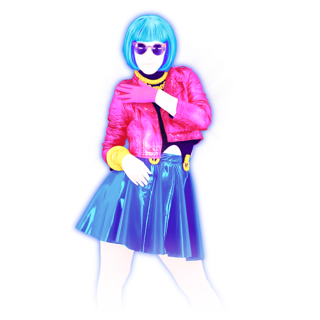 The dancer is a woman with light blue hair in a bob cut. She has dark violet sunglasses in the shape of a drop, with the pointy part being on the top corner. She wears three chunky golden necklaces and a shiny, red-magenta leather jacket that is dark violet inside. Underneath the jacket, the coach wears a dark violet suit that has a high neck, a big hole around each shoulder and armpit, and two vertical parts that are tied to the coach’s skirt with a golden button. The skirt is cobalt blue and cuts above the knee, and like the coach’s jacket, it also has a shiny effect. On her feet, the coach wears a pair of magenta heels with a violet heel and sole. She also wears a chunky golden bracelet on her left wrist and a pink glove on her right hand. Her outline is pink and faded, and it surrounds her whole body.