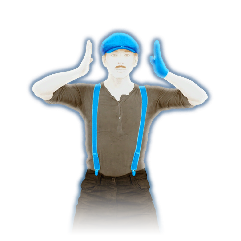 The dancer is a man who appears to be a warehouse employee or a worker from the 1940’s. He wears a blue cap, a gray shirt, brown pants with blue suspenders, a dodger blue glove, and black penny loafers. He also has a short brown mustache. At one point of the routine, the coach gets inverted, giving him black skin. However, his color scheme remains the same, although the pants and shoes turn white. He also has a film grain filter over him throughout the routine.