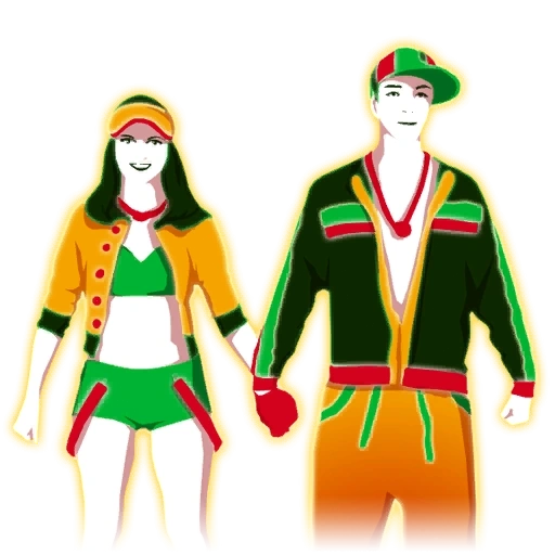 The female dancer is wearing a green swimsuit with an orange jacket, sneakers, and a red and yellow visor. The male dancer is wearing orange shorts with green pockets, a necklace, sneakers, a red, green and white hat, and a dark green zip up jacket with red, lighter green, and yellow stripes.