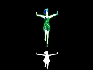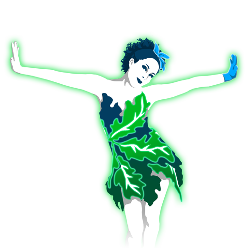 The dancer is a woman wearing a green leaf dress with a sky blue glove. She also has a sky blue flower in her hair with dark blue hair as well. She is barefoot.