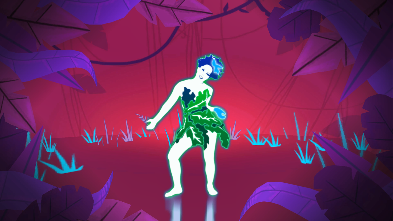 The routine starts with light purple and blue leaves covering the entire screen until the coach moves these away, revealing a dark pinkish-red jungle with blue vines, light blue grass, and light purple leaves. During the second chorus, bridge and start of the last chorus, the jungle turns into a dark purple color. The routine ends with the leaves covering the screen again. When the coach strikes her arms down, light blue ripples appear around her hands.