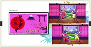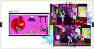 - In trailers for the game, there was a very brief preview of the choreography that differed from the finalized version. The background behind the fish tank was a diner with tables, ketchup, and mustard bottles instead of a purple living room.