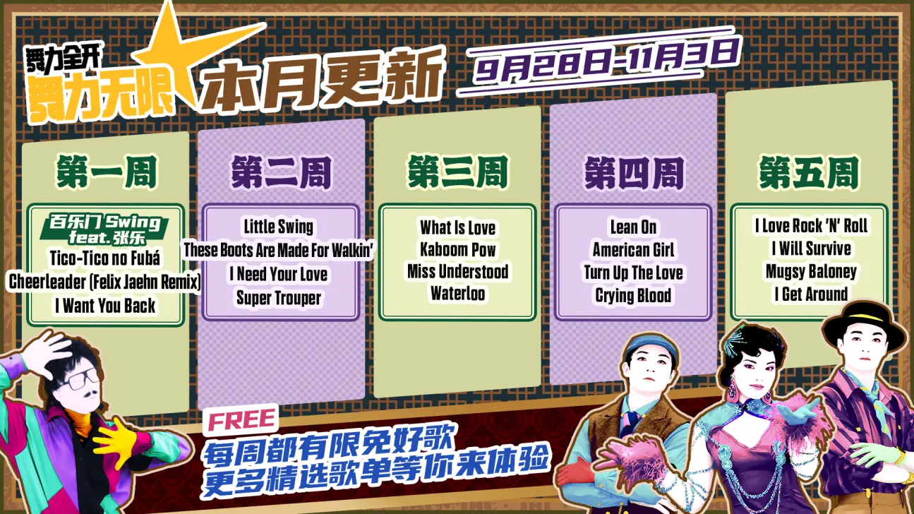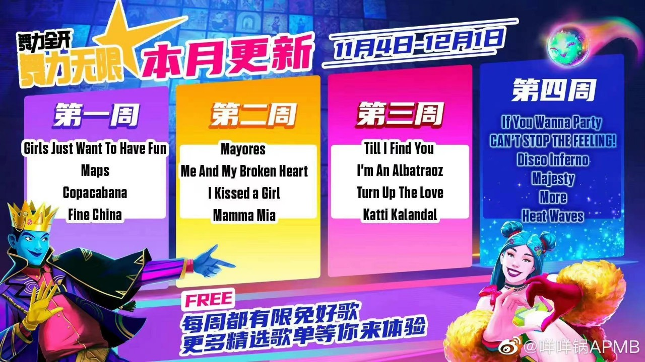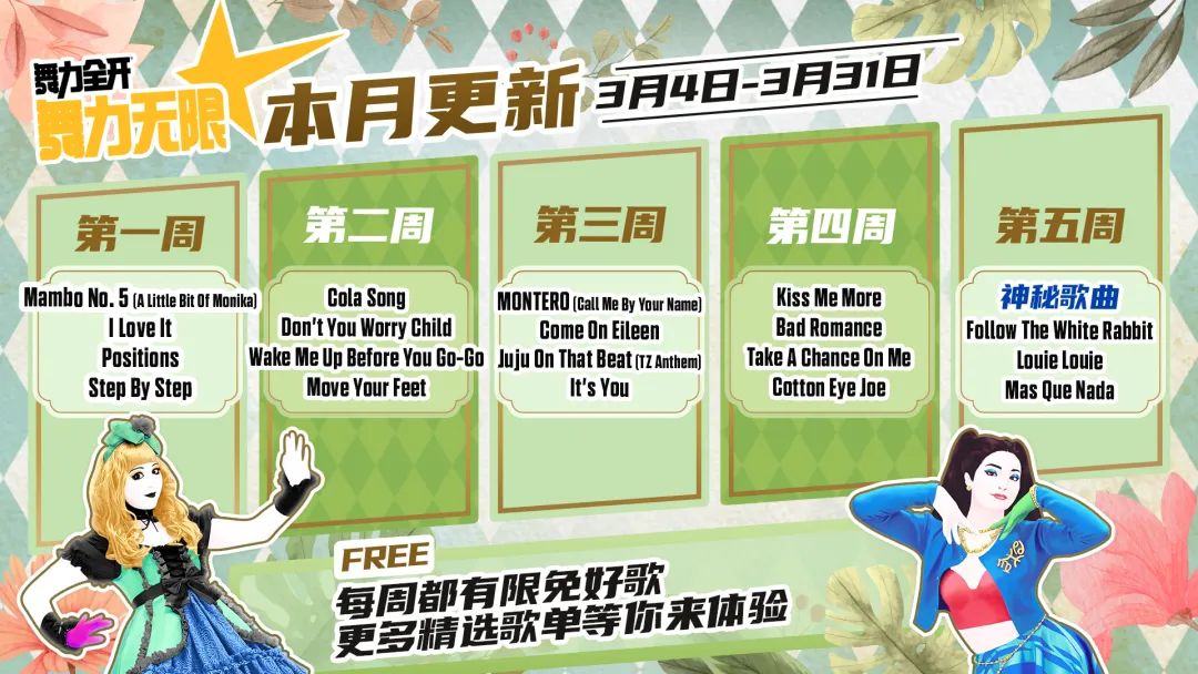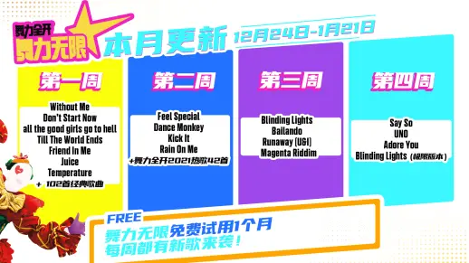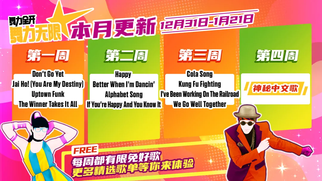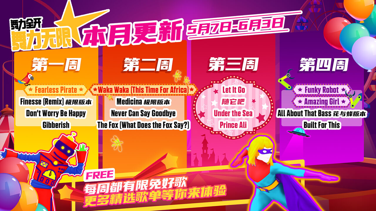 - 是我的益达 (Shi Wo De Yi Da) was also made free to play permanently after its release. Therefore, the current permanently free songs that are listed in 舞力无限 are Just Mario, Let’s Party (飞艇派对), 青春在召唤 (Qing Chun Zai Zhao Huan), Dare to Live, and 是我的益达 (Shi Wo De Yi Da).