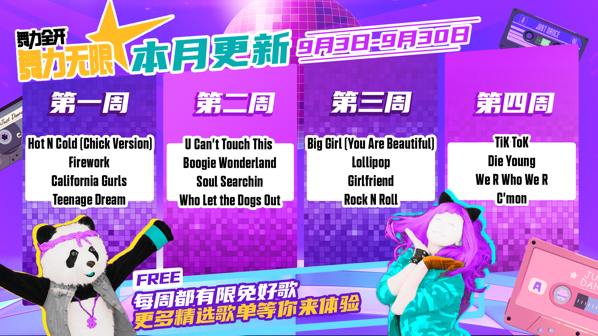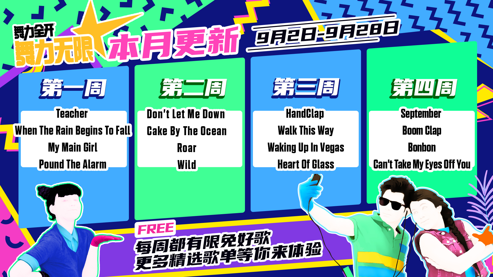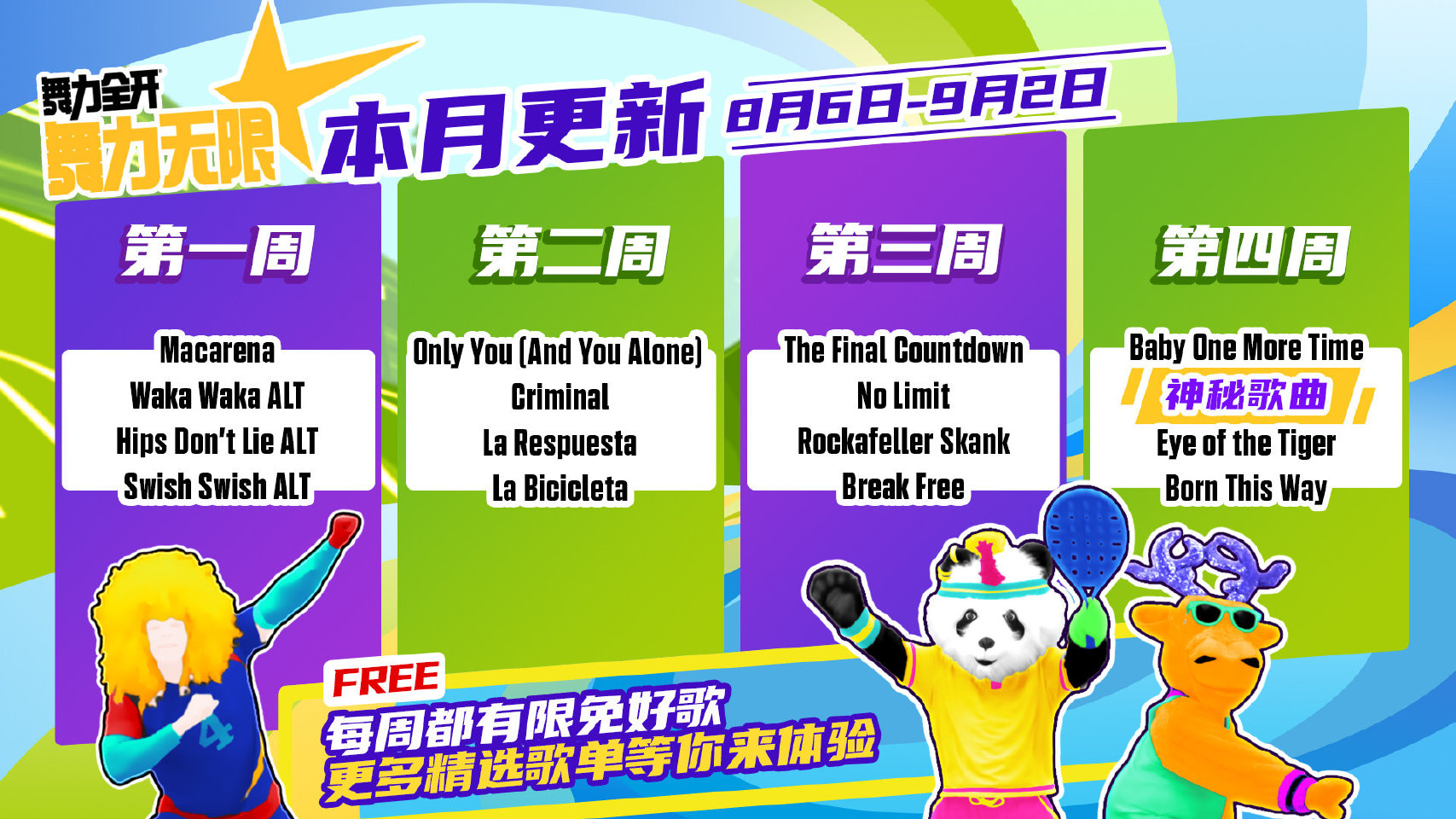 - 是我的益达 (Shi Wo De Yi Da) was also made free to play permanently after its release. Therefore, the current permanently free songs that are listed in 舞力无限 are Just Mario, Let’s Party (飞艇派对), 青春在召唤 (Qing Chun Zai Zhao Huan), Dare to Live, and 是我的益达 (Shi Wo De Yi Da).