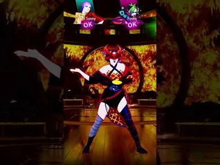 The dancer is Chitsuki, a female yokai who is possessing Michiya. Her appearance has been heavily altered, appearing as mixture between both Michiya and Chitsuki as they appeared in Zenit. On her head, she has blue lipstick, a red mask with two golden horns, and two small samurai swords holding black hair in place. She wears a sort of cropped, loose-fitting kimono with red edges that appears black on the outside and has a red-yellow grid pattern on the inside. She has two dark blue straps that crisscross over her chest to keep the kimono up as well as a dark blue obi. She wears a dark blue stocking with red strings and a tag on her left leg, and a shorter, transparent blue stocking with darker blue stranders on her right leg. Her shoes are black with red soles. She also wears a yellow glove.