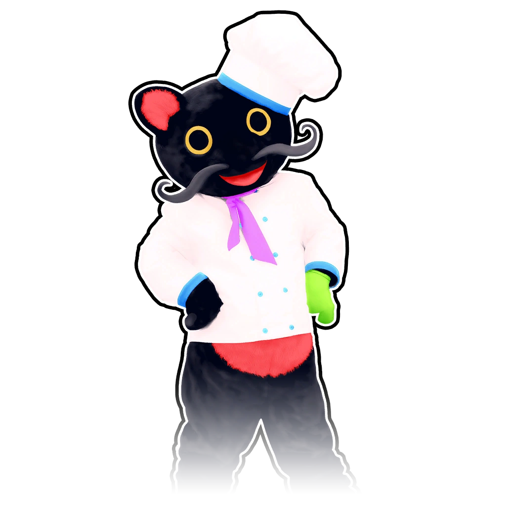 The coach is Felide, the cat from Magic Halloween, Shinobi Cat, and Space Cat. He is a black humanoid cat with yellow eyes and red inner parts of his ear and mouth. Sitting on the right ear is a white chef’s hat, with a blue brim on the bottom. He wears pink scarf on his neck and a chef’s upper uniform, which is white and has blue edges on the sleeves, that partially exposes his red underbelly. He also has a black Italian mustache on his nose. He has a black and white outline. His glove is lime green.