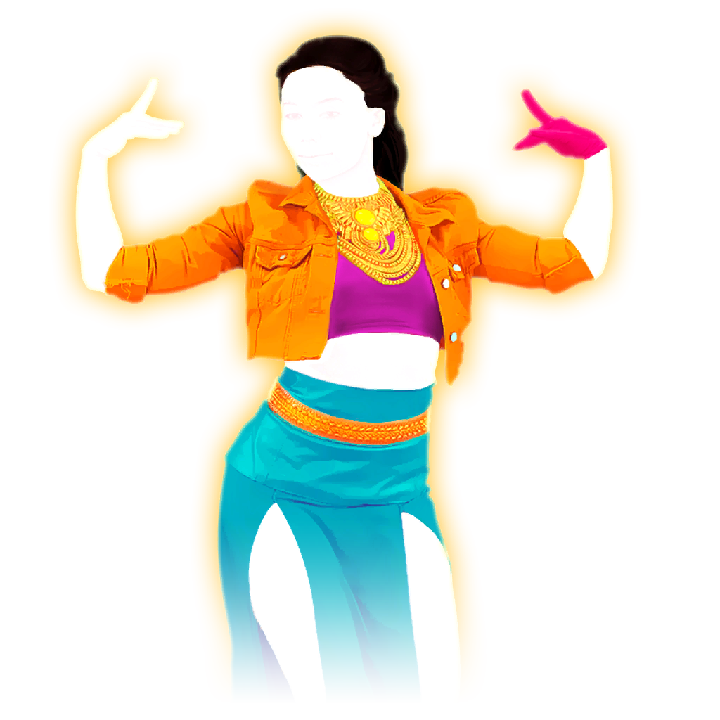The dancer is a barefoot woman with brown hair, and she wears an orange bolero jacket, a purple cropped tank, and neon blue split skirt. She also wears a dark pink glove, a gold belt, and matching necklace.