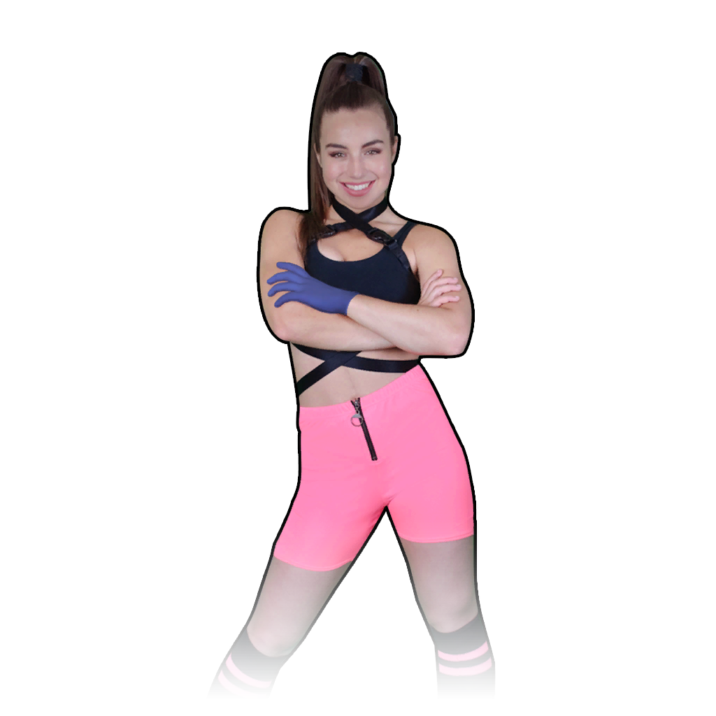 The dancer is Canadian social media personality Énola Bédard. She wears a black sports bra and light pink athletic shorts with a periwinkle glove. She also wears black socks that have two pink stripes at the top, as well as black sneakers with loosely tied laces. Her hair is tied into a ponytail.