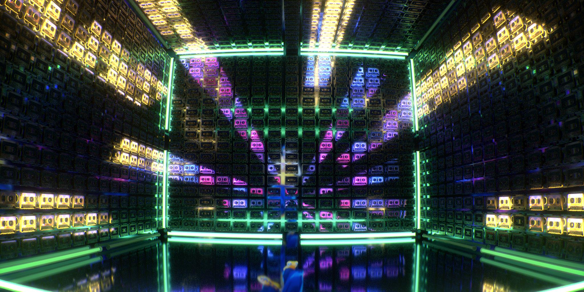 The routine takes place in a room. It has a wall lined with cassettes, all of which glows lime, light yellow, fuchsia, and aqua blue, and makes many patterns. The wall also reflects Kyran’s back. The room also has long neon lights that also glows lime, light yellow, fuchsia, and aqua blue, and a reflective floor. In the final part of the routine, where Gold Move 3 is, the cassettes and lights turns off, which it then fades to black.