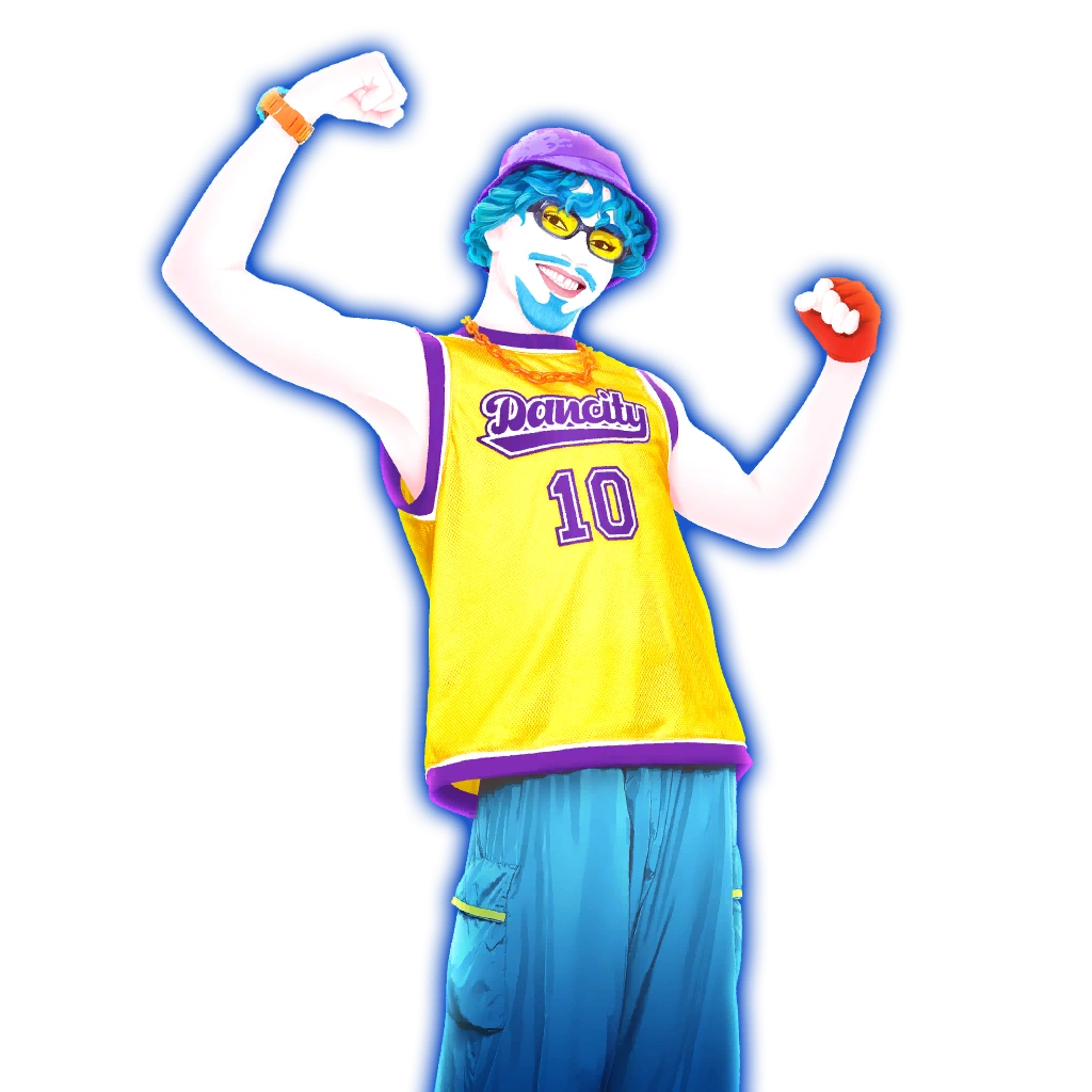 The dancer is a man named Kyran, who resembles Jack Harlow. He has shaggy blue hair, a beard and neon yellow shades. He wears a purple bucket hat, a yellow Dancity basketball tank with an orange chain necklace and watch, baggy blue pants, and yellow sneakers with green, red, and blue accents. His fingerless glove is red.