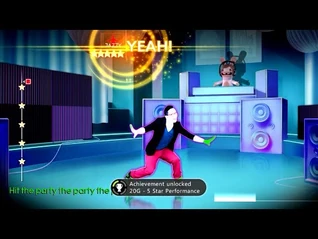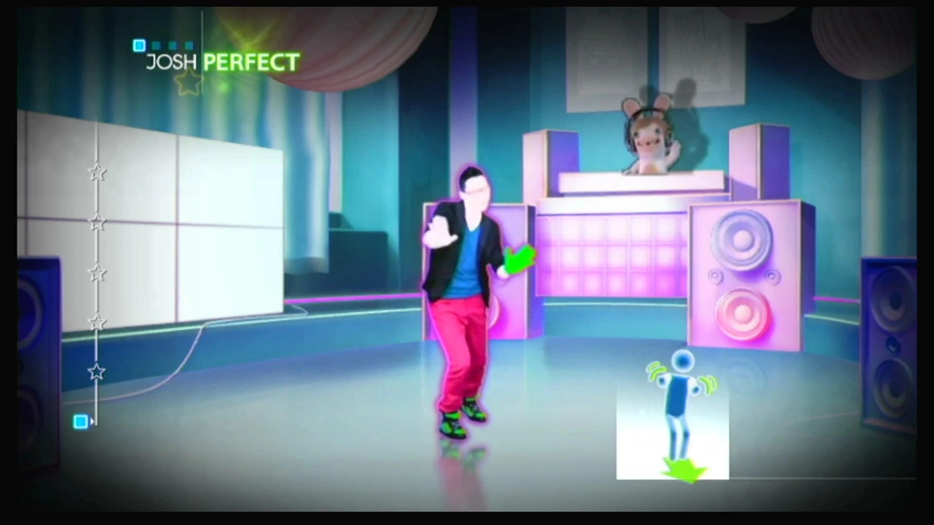The routine appears to be a room in the coach’s house, and the coach is having a party by himself (with a Rabbid as the DJ). The color scheme appears to be shades of blue and light pink most of the time, and black during some parts of the song. Behind the coach is a DJ turntable for the Rabbid, and Just Dance 4 posters hanging above the turntable. On the left and right are screens that play the official music video. In the NTSC Wii DLC version, the screens are blank. Around the TVs are some speakers with neon outlines.