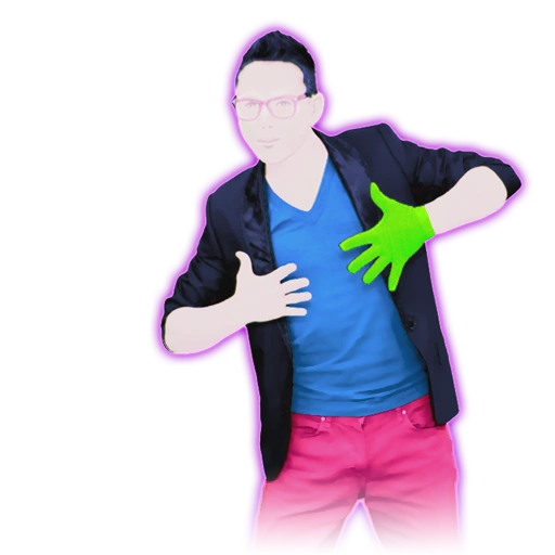 The dancer is a man who has navy-black hair which looks a tiny bit spiky. He is wearing red glasses, a dark blue jacket with sleeves rolled up to the elbows, a blue v-neck shirt, pink trousers, and black sneakers with green accents. His glove is neon green and has a lavender outline.