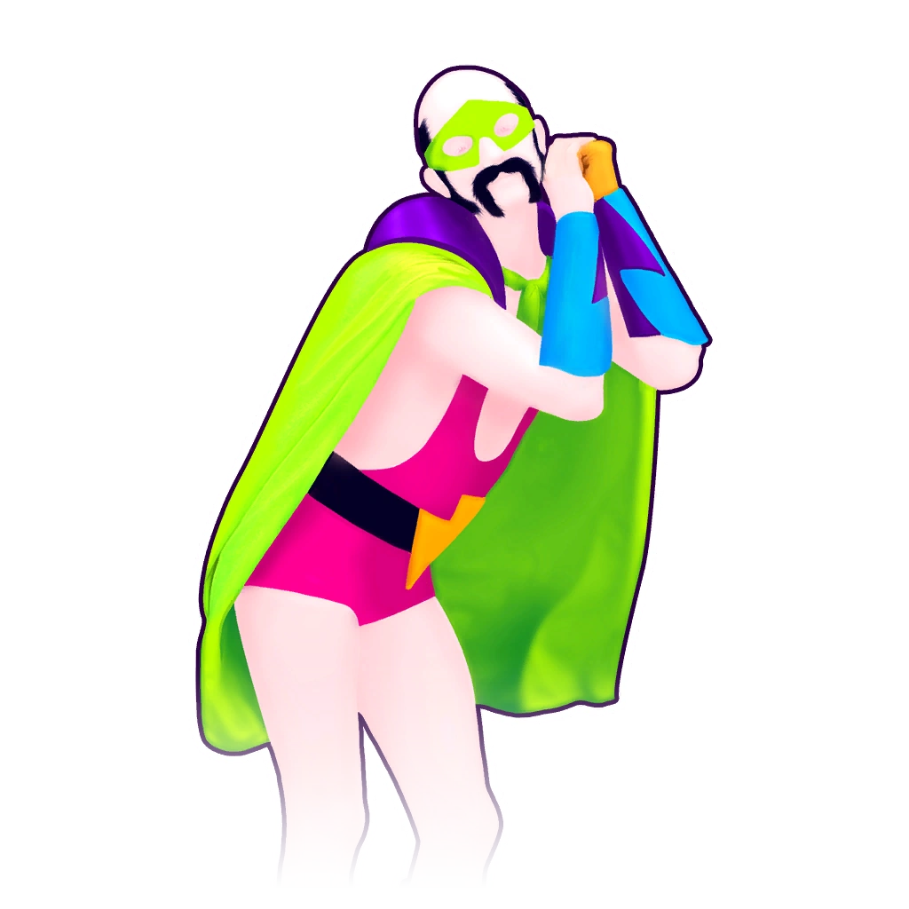 The dancer is a superhero with very short black hair and a handlebar-styled mustache. He wears a hot pink tight-fitting, sleeveless superhero costume, a bright lime green pelerine, a soft yellow glove, and a bright lime green mask. On his hands, he has light blue and purple armlets. He also wears light blue and black boots and a black belt with a gold lightning symbol.