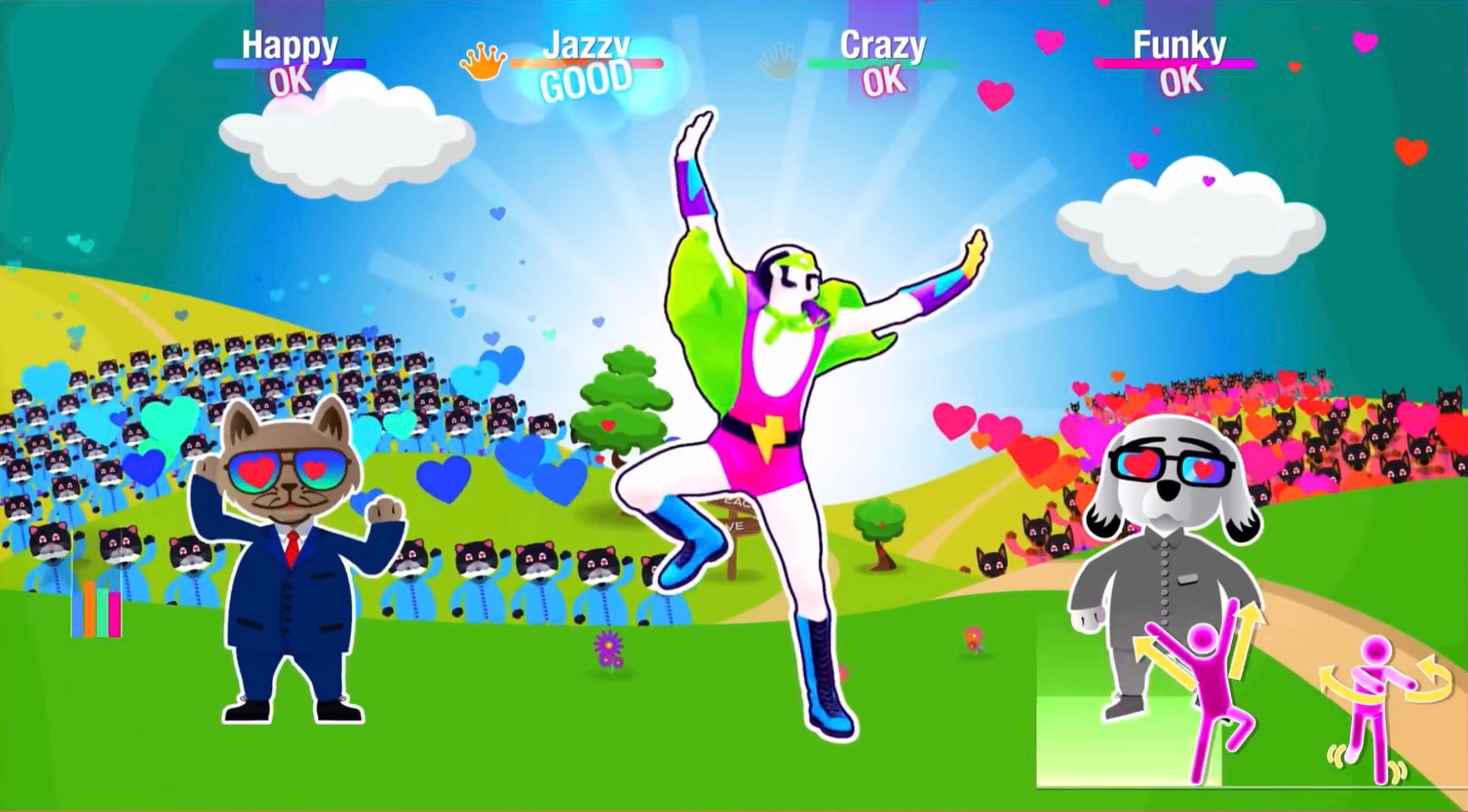 The routine starts with a political debate between a cat in the blue corner and a dog in the orange one. In the verse, the coach is transported to a battlefield where the cat and dog are preparing to fight in a tank resembling a cat and a dog respectively, with soldiers coming in behind them and soon after firing fish bones and dog bones at one another. During the choruses, the fighting stops with the cats and dogs dancing to the song with hearts in their eyes. At the start of the bridge and the end of the routine, the coach, as well as the cat and the dog, is brought into outer space with the coach on a small purple platform, and the cat and dog each in their own spaceship.