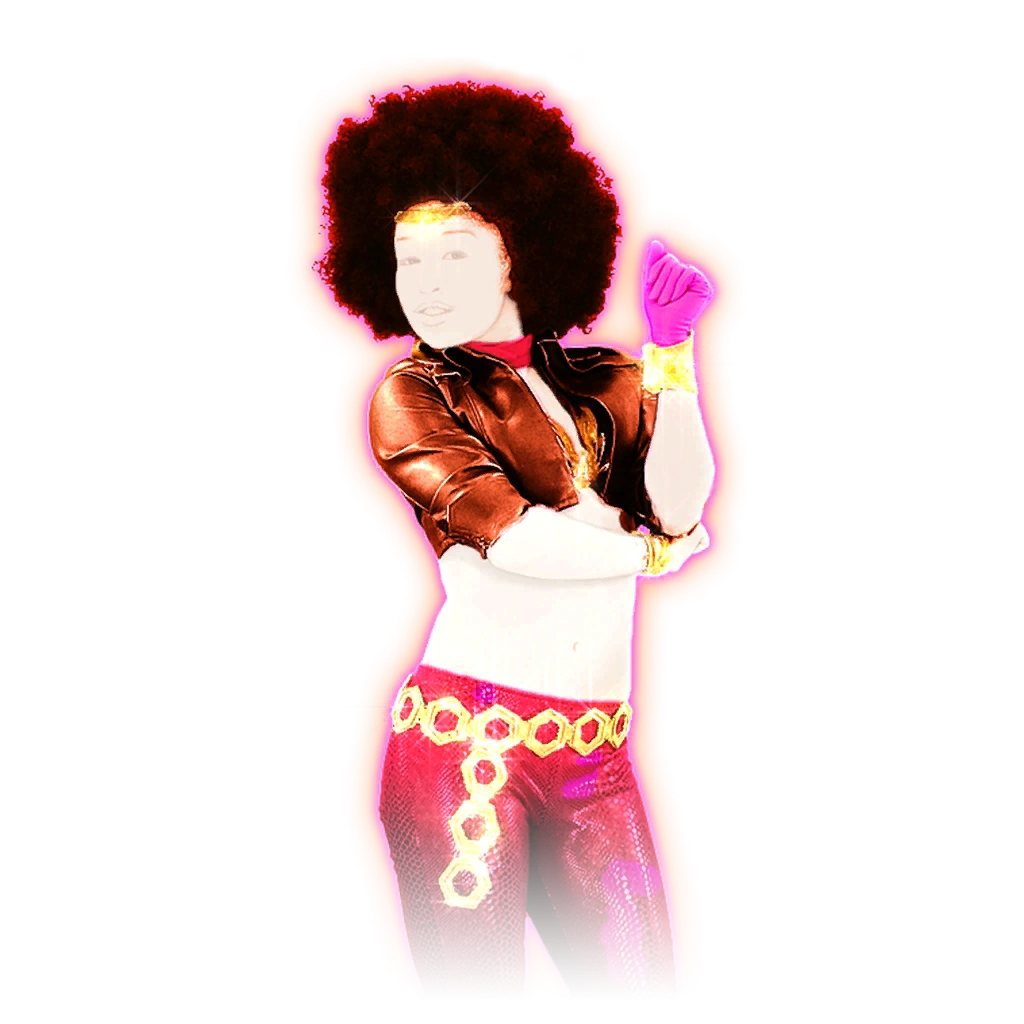 The dancer is a woman. She has a black afro and wears a pair of red metallic pants, an orange bra under an orange cropped jacket, a red bandana on her neck, and brown platform lace up heels. There is a chain attached to her pants. She also wears a magenta glove, specifically purple pizzazz.