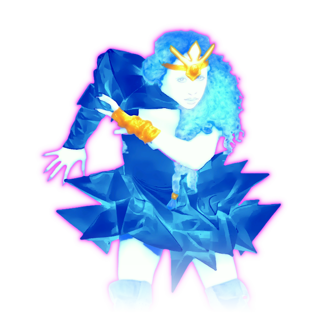 The dancer is Frost,[4] a woman who appears to be an ice queen. She wears an ocean blue dress that seems to be made of ice. The left sleeve of the dress is cut out and jagged ice edges and crystals extrude from sides of the dress as well. She has long semi-puffed ice-blue hair that is chalked white to give it an icy feeling. She also wears long ice-blue high heel boots with straps and a golden crown which wraps around her forehead. At specific times of the song, her skin turns pitch black, and her dress, boots, a golden glove, and hair become a darker shade of blue. A pink translucent aura surrounds her.