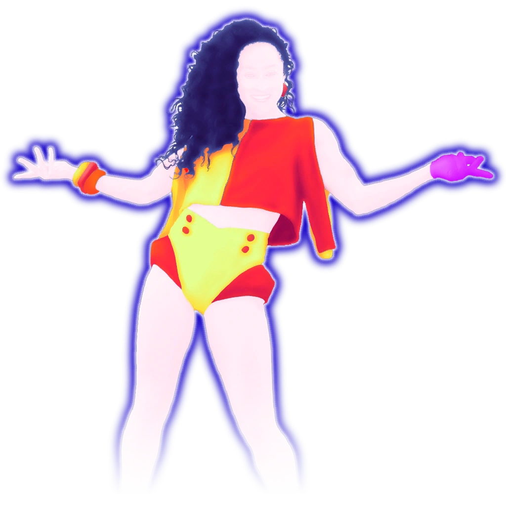 The dancer is a woman with dark blue curly hair. She wears red earrings, a yellow and red crop tank, yellow shorts with red padded hips and buttons, red heels, and a yellow and red bracelet. She has a dark blue outline and wears a heliotrope-colored glove.